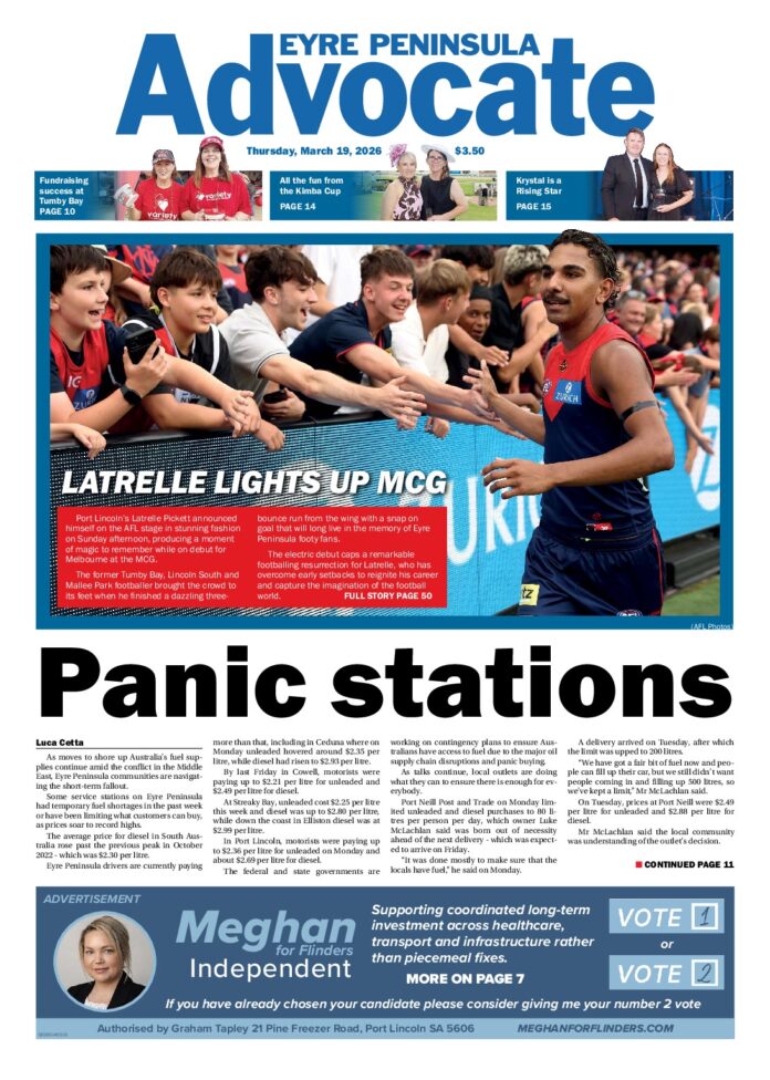 Eyre Peninsula Advocate Cleve – 19th March 2026 Subscribe or Login to see the rest of the content. Username Password * Remember Me Forgot Password News Clinic to care for EP 25/04/2026 Port Lincoln Skin Cancer Clinic is set to save many lives, led by highly experienced doctor/surgeon Zac Baran. Located at 4 Boston Street, Port Lincoln,... Cummins and Yeelanna honour service efforts 25/04/2026 Cummins and Yeelanna community members came together to honour past and present service men and women this Anzac Day. At 6.30am people of all... Ceduna hails ‘spirit of sacrifice’ on Anzac Day 25/04/2026 The Ceduna community came together on Saturday morning to honour those who fought and died for Australia at the annual Anzac Day dawn service. A...