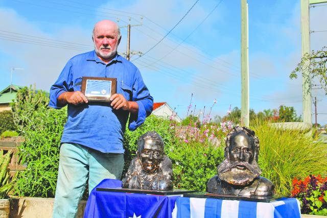 Ray North with busts of George and Lydia, which were displayed in the SA Migration Museum last year. He holds a special placard presented to him by the Greek Deputy Defence Minister. PHOTO: MITCHELL PATERSON