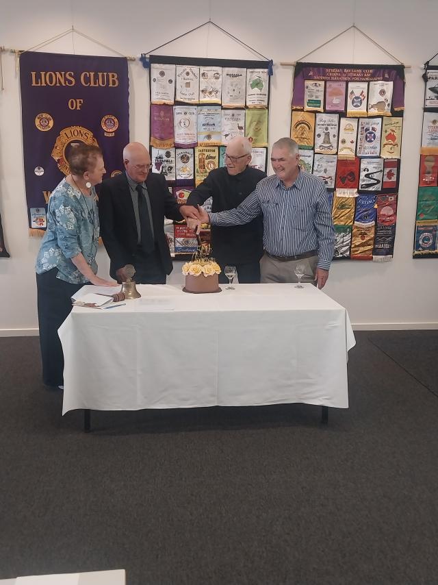 Wudinna Lions Club president Marlene Boylan with charter members Brian Payne, Frank Bubner and Kevin Cook cutting the club's 50th birthday cake. (Supplied)