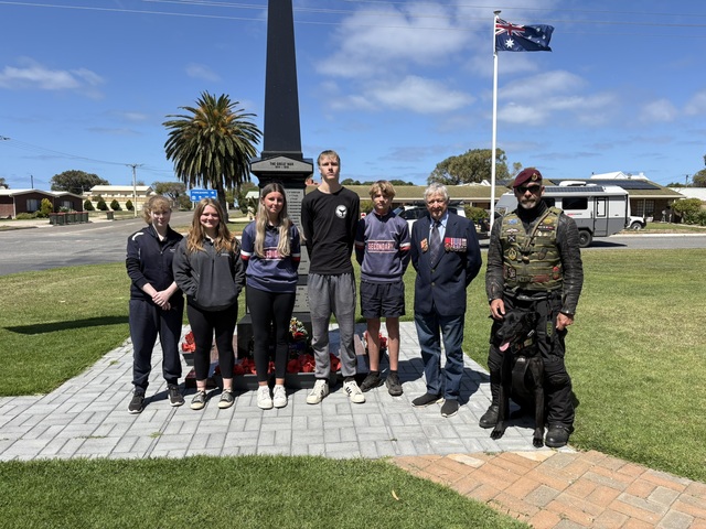Elliston Area School students Zali Reed, Rebecca Wright, Sienna Moyle, Koby Brierley and Mitchel Wandel led the town’s Remembrance Day commemoration service, and are pictured with Darrell Tree CV and travelling veteran Ben Meighan. (Elliston Area School)