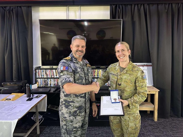 Captain RAN Brett Westcott presents Sergeant Mikaela Harris with an Australian Defence Force bronze commendation award. (Supplied)
