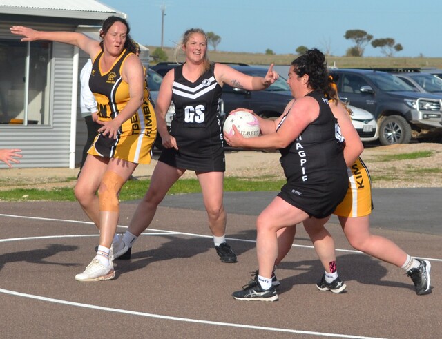 Kimba defender Kellie Hunt comes to close Ports goal attack Erin Calliss in the C grade match, with goal shooter Breeann Anderson looking on. (JUDITH REHN)