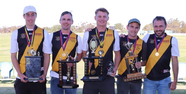 Kimba Districts' A grade rising star Cooper Hannan, best team man Reece Rayson, best and fairest and players’ player Aaron Nietschke, runner-up best and fairest Josh Seal and coach’s trophy winner Dale Rayson. (Ashleigh Inglis)