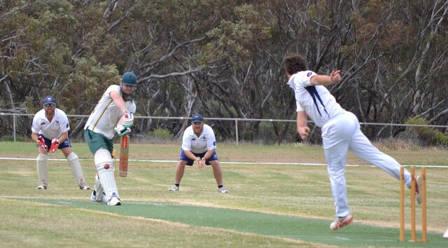 Dusty Wheare, who batted well for Lock, faces a Ryan Siebert delivery, with Jamie Pearson behind the stumps and Zac Meyer alongside, for Darke Peak. (Sarah Meyer)