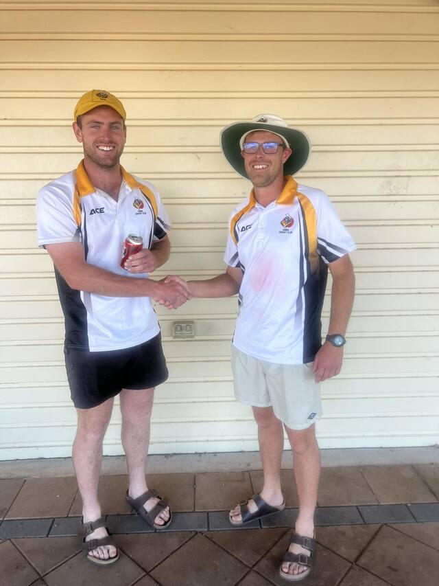 Bailey Francis is congratulated on being Kimba Cricket Club’s A grade player of the day on Saturday by sponsor Kimba Motorbody Repairs’ Kurt Wright. (Supplied)