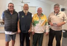 Players rugged up to battle very cold and windy conditions to play in Kimba Bowling Club’s cosmo three-bowl triples on Saturday 11 April.